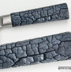 Uniek in de wereld zijn de mesheften en blokken gemaakt van gebrand hout. In een gepatenteerd proces wordt de gebrande laag geïmpregneerd met een kunststof om hem zijn sterkte te geven.