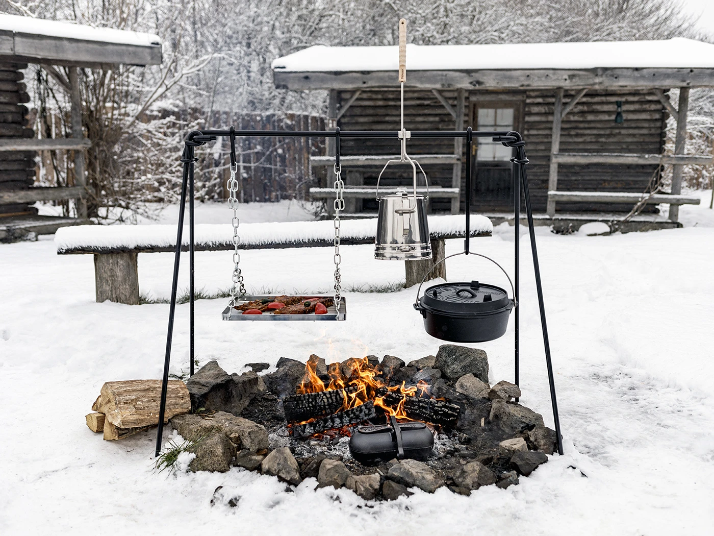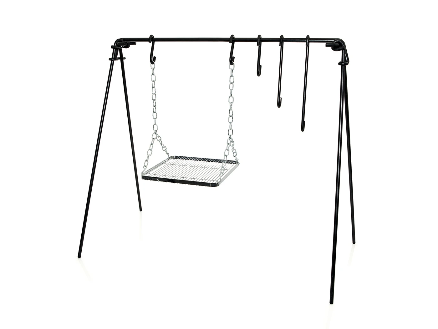 Met de Petromax vuurbrug kunnen kookpotten zoals de Dutch Oven worden opgehangen boven het vuur, waardoor de hitte gelijkmatig wordt verdeeld en de inhoud van de kookpot niet aanbrandt. Hierdoor is het mogelijk om op een veilige en effectieve manier buiten te koken met behulp van een open vuur. Je kan de pannen of ketels ophangen aan de drie haken met verschillende lengtes om zo de afstand tot het vuur aan te passen en de kooktemperatuur van je gerechten en dranken te regelen. Het grillrooster heeft een flexibele, in lengte verstelbare kettingophanging.